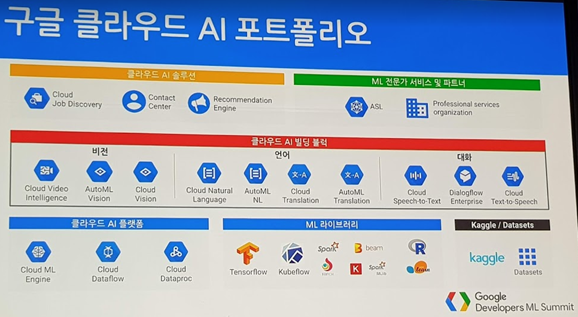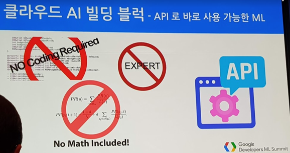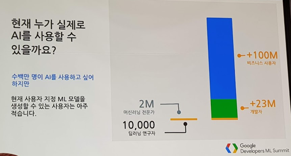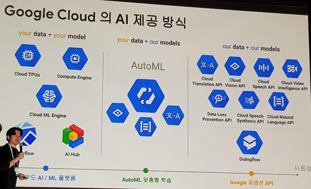 - 개인적으로 기억이 많이 남은 세션, ML을 공부 및 업무에 적용하려면 많은 수학 개념 및 데이터, 인프라 등을 신경 쓰지 않을 수 없는데, 구글에서는 이에 대해 좀 더 쉽게 접근하고 활용할 수 있도록 서비스 제공